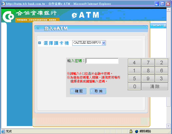 | 步驟六:加強網路交易安全,將晶片精融卡取出再重新插入讀卡機-->並再次輸入密碼 |